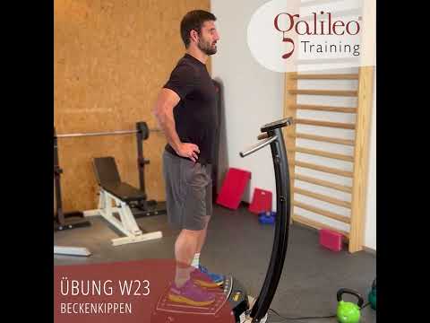 Grundhaltung: Stand auf Galileo. Hände fassen das Becken zur Führung. Oberkörper aufrecht halten und Knie bleiben gestreckt.
